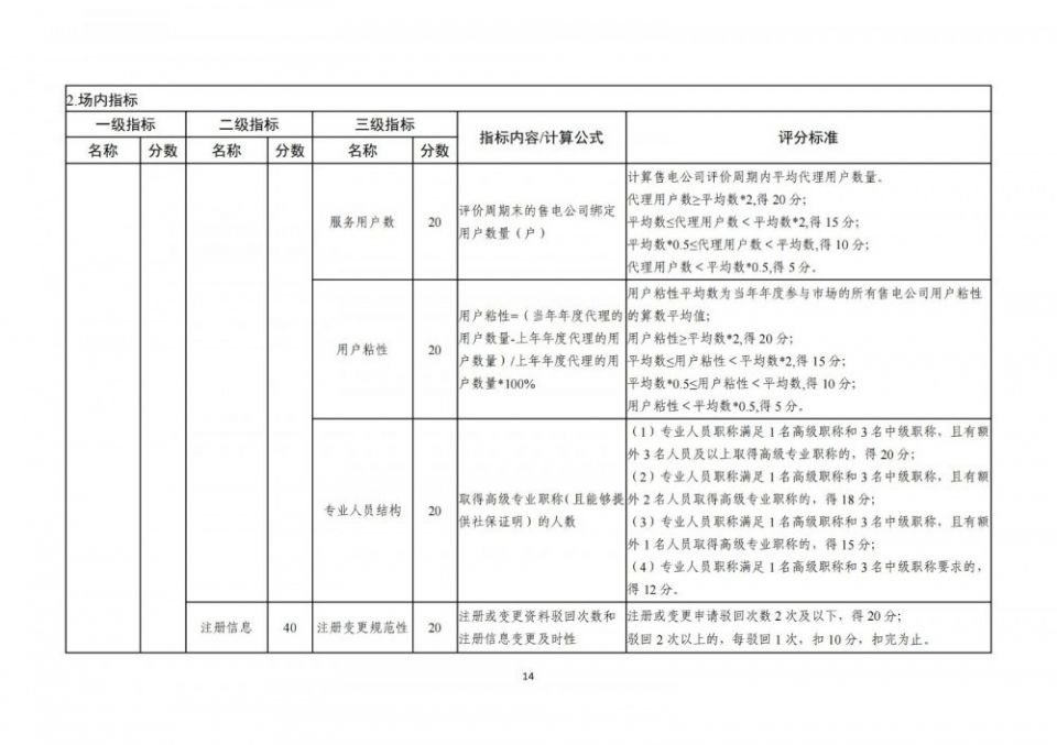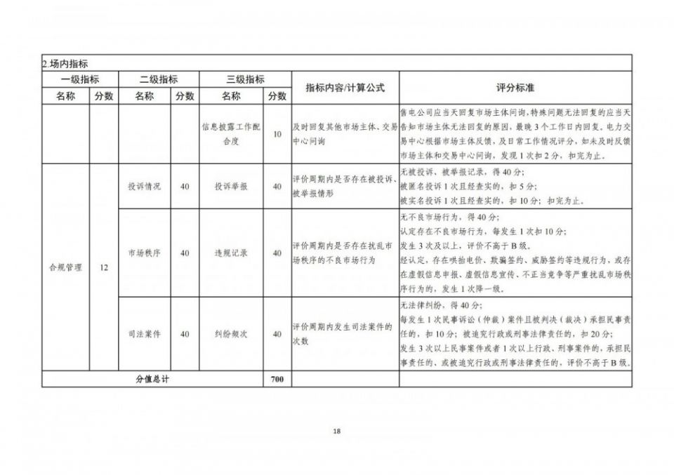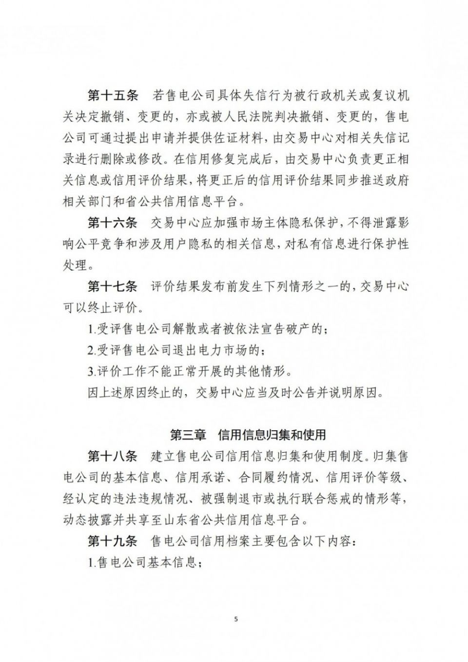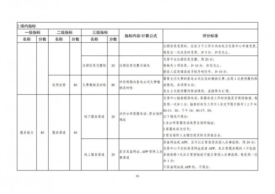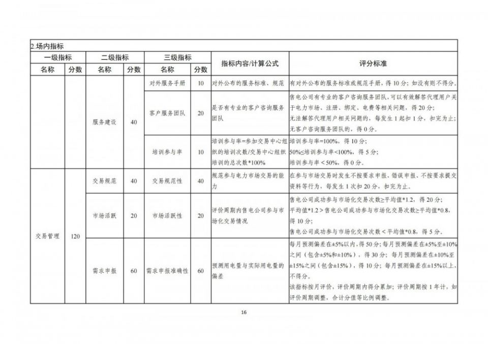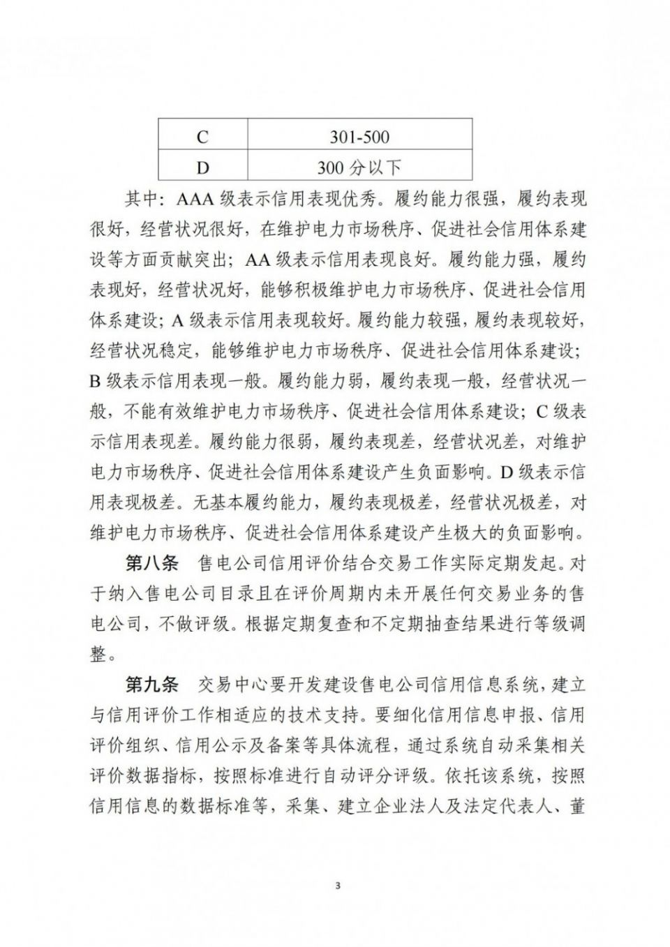 6月25日山东省发改委发布关于征求《山东省售电公司信用评价管理办法(试行)》(征求意见稿)规范性文件意见的通知。通知指出,山东省售电公司信用评价管理工作,坚持政府推动、社会共 建、公正透明、防范风险、褒扬诚信、惩戒失信的原则,由山东省发展和改革委员会负责,山东省发展改革委、省能源局、山东能源监管办按照职责分工实施监管。山东电力交易中心有限责任 公司按照《山东省信用服务机构监督管理办法(试行)》的相关规定,完成信用服务机构自主申报取得相关资质后,由省发展改革委授权其具体承办山东省售电公司信用评价工作。授权期限自 《管理办法》发布之日起两年内有效。开展信用评价的主体为已获得电力市场准入、在山东电力市场注册生效,并参与山东电力市场交易的售电公司。售电公司信用评价标准为《指标体系》, 总分为 1000 分。其中,场外评价指标权重 300 分,场内评价指标权重 700 分。评价结果采用“四等六级制”,具体依据信用评价得分情况,等级分为 AAA、AA、A、B、C、D。