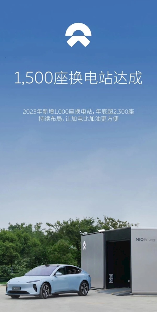 蔚来汽车今日宣布,截至2023年6月25日,蔚来全国换电站布局数量突破1500座,累计建成16204根充电桩,2023年新增1000座换电站,年底将超2300座。