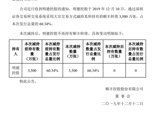 12月12日,顺丰(股票代码:002352)发布《 关于控股股东减持公司可转换公司债券的公告》,称控股股东深圳明德控股发展有限公司(以下简称“明德控股”)于2019年12月10日,通过深圳证券交易所交易系统采用大宗交易方式减持其所持有的顺丰转债3500万张,占本次发行总量的60.34%。