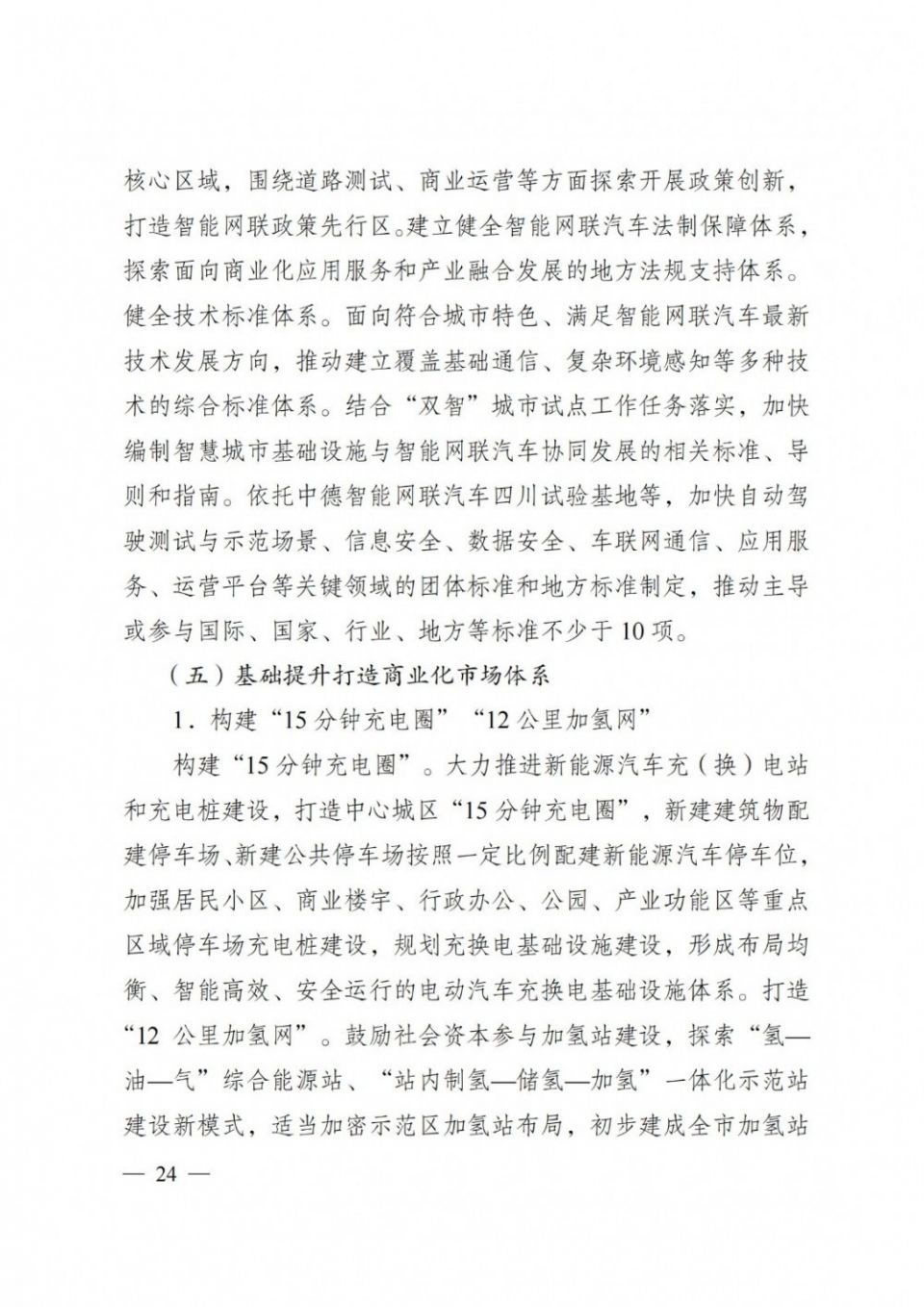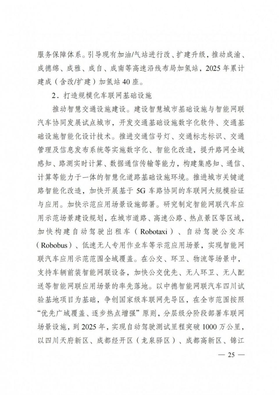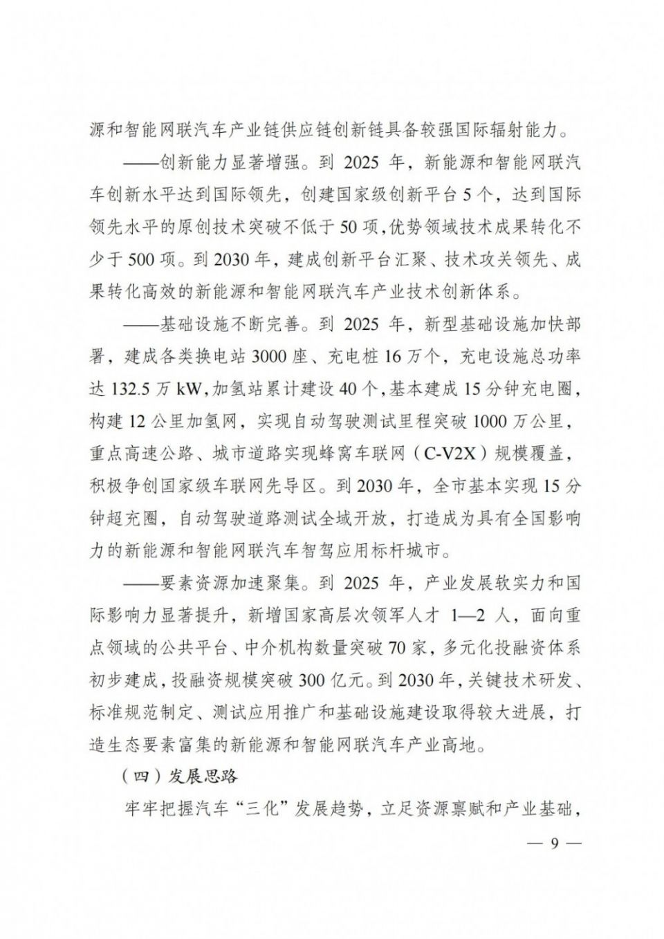 《规 划》明确基础设施不断完善。到2025年,新型基础设施加快部署,建成各类换电站3000座、充电桩16万个,充电设施总功率达132.5万kW,加氢站 累计建设40个,基本建成15分钟充电圈,构建12公里加氢网,实现自动驾驶测试里程突破1000万公里,重点高速公路、城市道路实现蜂窝车联网(C- V2X)规模覆盖,积极争创国家级车联网先导区。到2030年,全市基本实现15分钟超充圈,自动驾驶道路测试全域开放,打造成为具有全国影响力的新能源 和智能网联汽车智驾应用标杆城市。