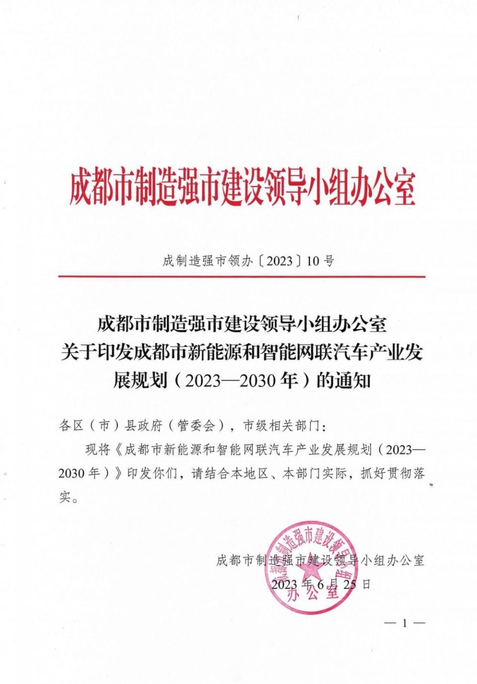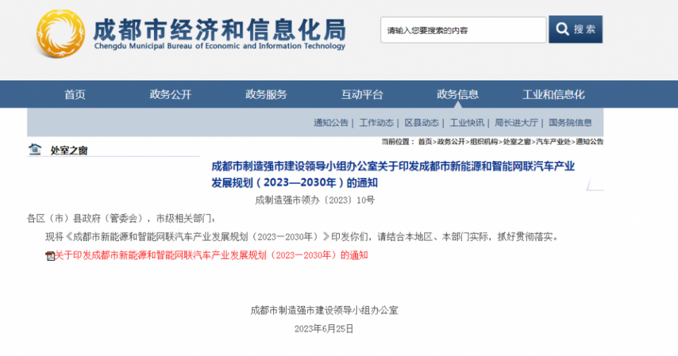 6月25日,成都市制造强市建设领导小组办公室印发关于《成都市新能源和智能网联汽车产业发展规划(2023—2030年)》(以下简称《规划》)的通知。