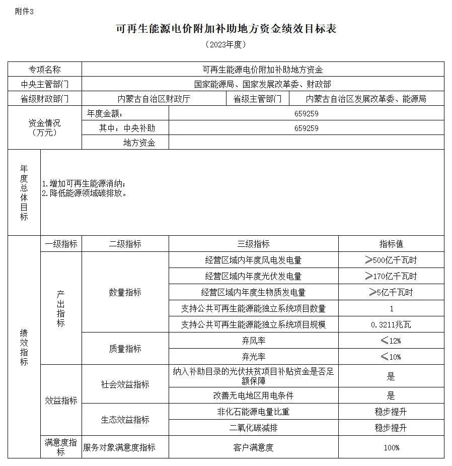 根据财政部会同有关部门印发的《关于印发<可再生能源电价附加资金管理办法>的通知》(财建〔2020〕5号,以下简称《资金管理 办法》)、《关于<关于促进非水可再生能源发电健康发展的若干意见>有关事项的补充通知》(财建〔2020〕426号)等文件要求以及你单位 申请,现下达2023年度可再生能源电价附加补助资金预算。资金支付方式按照财政国库集中支付有关制度执行,具体金额见附件2。项目代码和名称为 “10000017Z175060070001可再生能源电价附加补助地方资金”,收入列2023年政府性基金预算收入科目“1100407节能环保”, 支出列2023年政府性基金预算支出功能分类科目“2116001风力发电补助”、“2116002太阳能发电补助”、“2116003生物质能发电补 助”,列2023年政府预算支出经济分类科目“50799其他对企业补助”。有关事项通知如下: