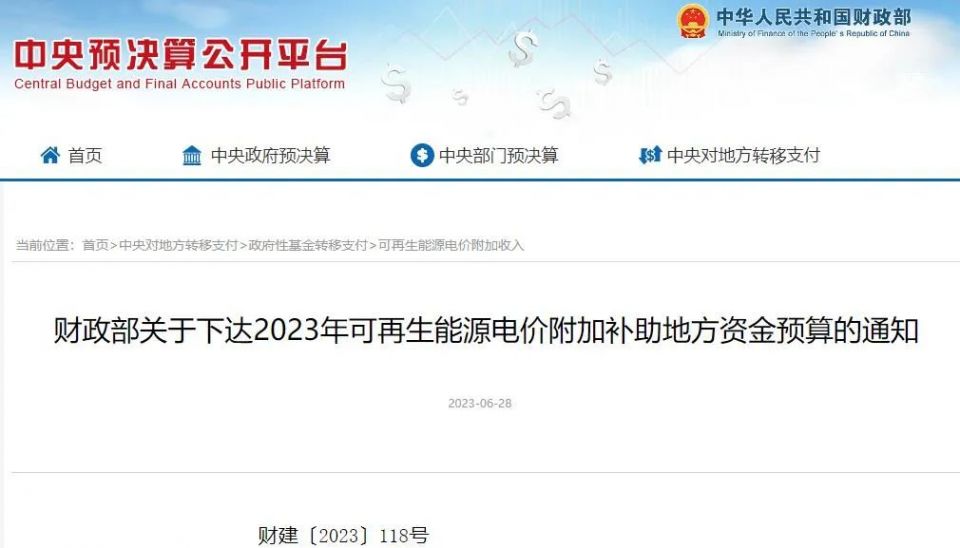 6月28日,财政部发布《关于下达2023年可再生能源电价附加补助地方资金预算的通知》(简称《通知》)。