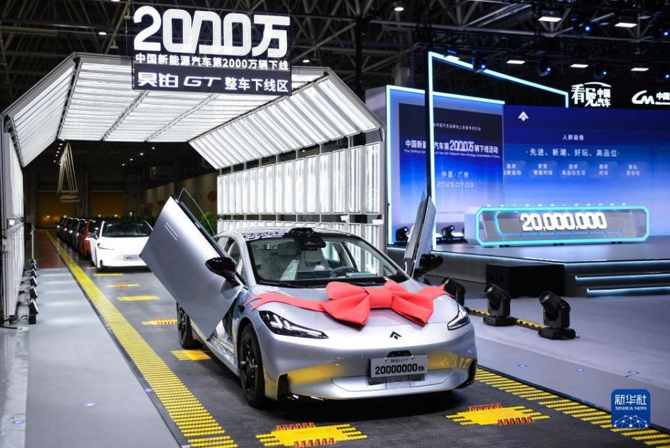 新能源*汽车 中国新能源汽车第2000万辆下线活动在广州举行 2023-07-04 09:27:15 分享 7月3日在广州广汽埃安第一智造中心拍摄的作为中国第2000万辆下线的新能源汽车的昊铂GT。当日,中国新能源汽车第2000万辆下线活动在广州广汽埃安第一智造中心举行。新华社记者 邓华 摄