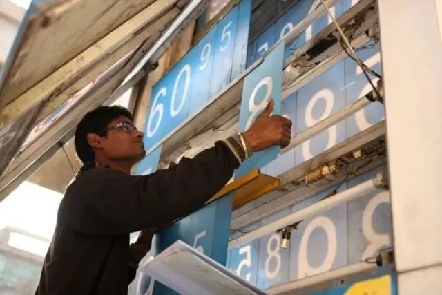印度首都新德里一家加油站的员工在更新价格。(新华社)