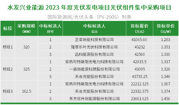 国际能源网/光伏头条(PV-2005)获悉,7月5日,水发兴业能源2023 年度光伏发电项目光伏组件集中采购项目各标段中标候选人公示。正泰新能科技有限公司、隆基乐叶光伏科技有限公司、晶科能源股份有限公司、常熟阿特斯阳光电 力科技有限公司、一道新能源科技股份有限公司、天合光能股份有限公司、东 方 日 升新能源股份有限公司7家企业入围。