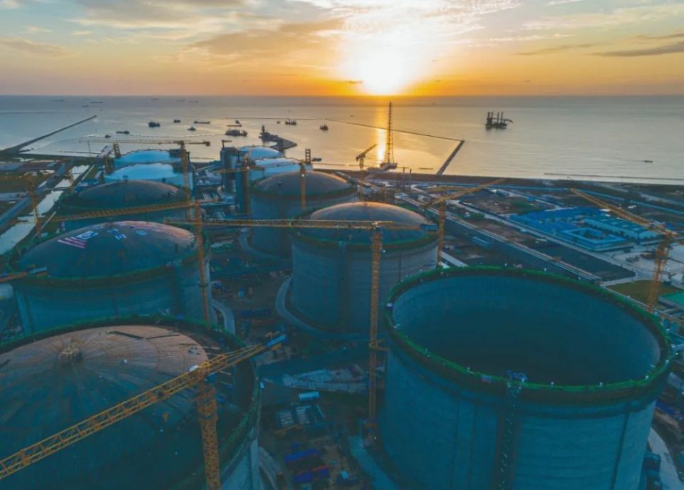 中海油盐城绿能港一期扩建工程10号LNG储罐顺利升顶到位。