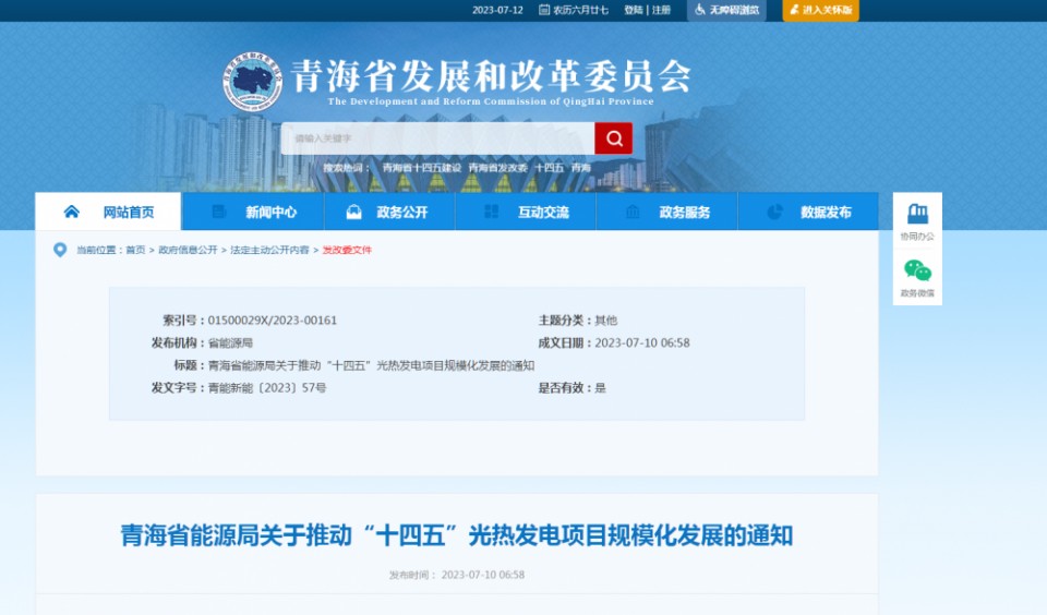 7月10日,青海省发改委发布《关于推动“十四五”光热发电项目规模化发展的通知》。