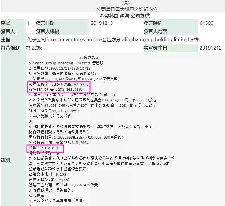 本次富士康创投共出售了阿里巴巴133.8万股ADS,交易价格为每股ADS 203.82美元,交易总金额达2.72亿美元(约19亿人民币)。