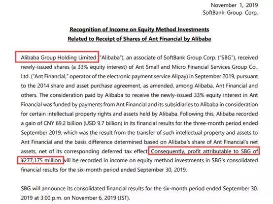 2019年11月1日,软银集团曾公告,作为营业外收益,在今年7至9月的合并财报(国际会计标准)中计入与投资对象阿里巴巴集团相关的2771亿日元收益。