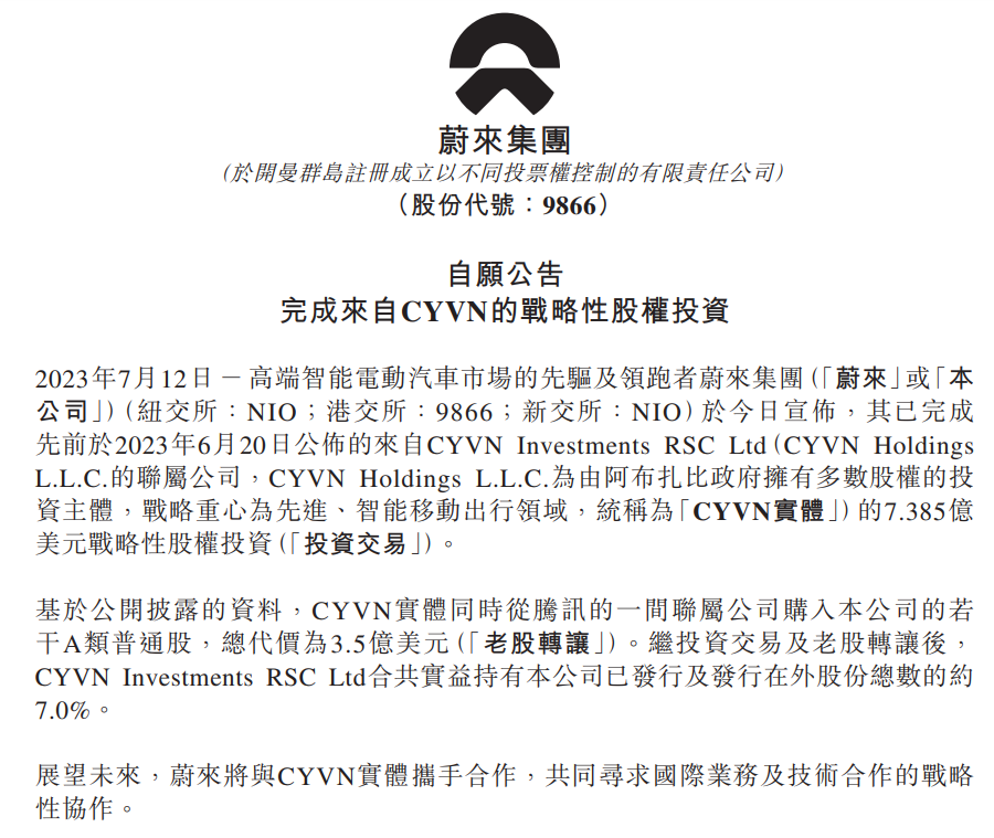 7月13日,蔚来发布公告,称其已完成先前公布的来自阿联酋阿布扎比旗下投资机构CYVN Holdings 的7.385亿美元战略投资。