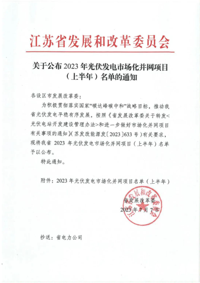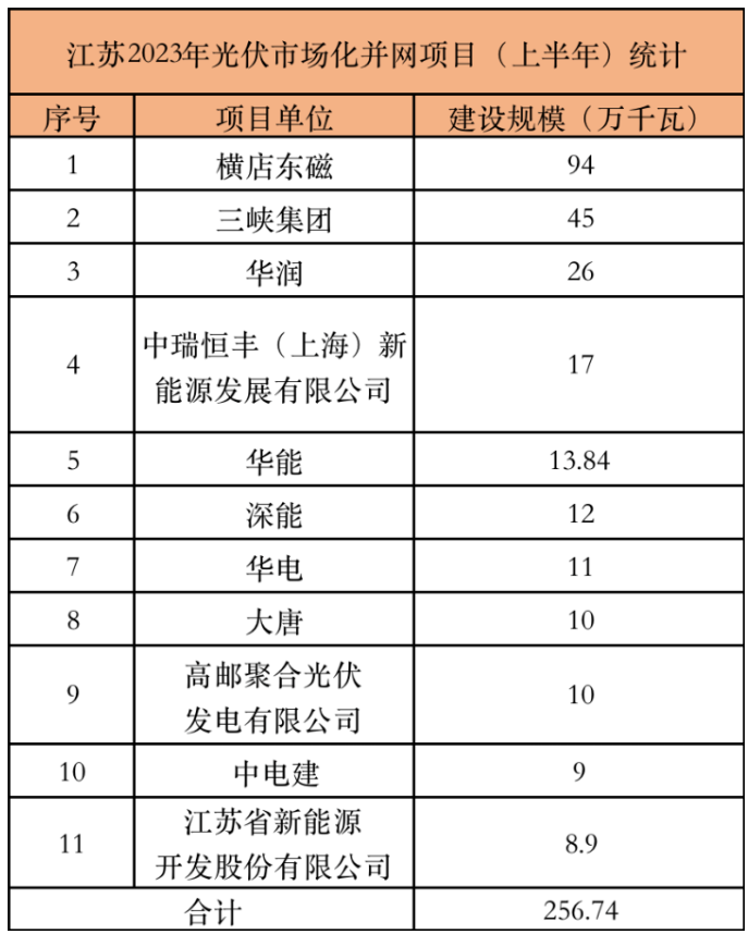 近日,江苏省发展和改革委员会公布了2023年光伏发电市场化并网项目(上半年)名单,根据数据梳理。此次总计项目22个,规模2567.4MW,其中横店东磁、三峡集团、华润分别以940MW、450MW、260MW领衔。