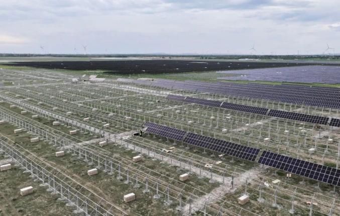 这是张家口市康保县张纪镇一处施工中的光伏发电场(7月11日摄,无人机照片)。