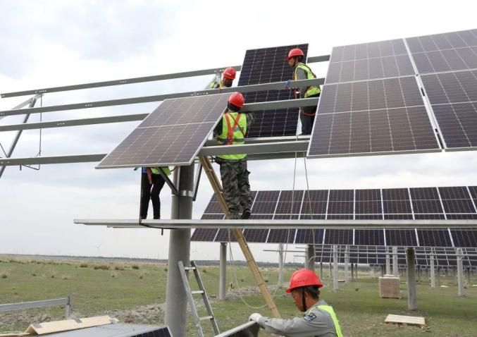 7月11日,在张家口市康保县张纪镇,工人在一处光伏发电场建设工地施工。新华社记者 杨世尧 摄