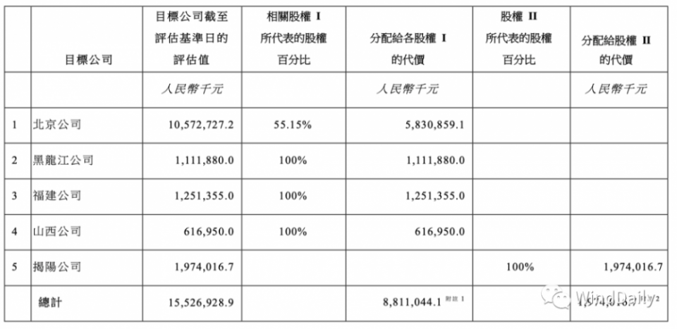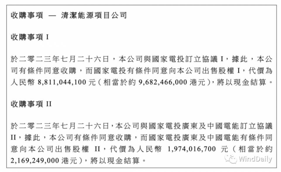 其中,中国电力与国家电投签订协议,收购北京公司55.15%的股权,福建公司、黑龙江公司及山西公司100%的股权,交易价为人民币88.11亿元;与国家电投广东及中国电能订立协议,收购揭阳公司100%的股权,交易价为人民币19.74亿元。两笔交易将以现金结算。