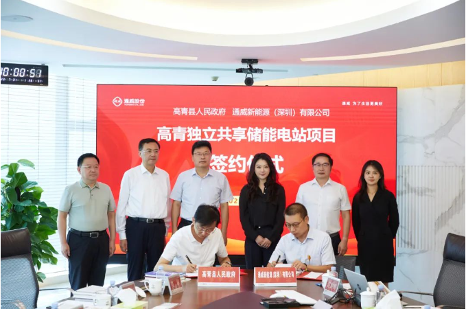 7月31日,通威新能源高青独立共享储能电站项目签约仪式在通威国际中心成功举行。山东省淄博市委副书记、市长赵庆文,通威股份董事长、CEO刘舒 琪,通威股份副董事长严虎出席并见证签约。通威新能源有限公司总经理助理何一弘,通威新能源(深圳)有限公司总经理邓卫平等全程参加。