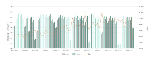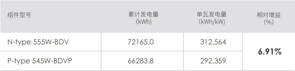 在2023年5月18日-7月19日两个月测试期间,该电站中的N型TOPCon组件有更好的发电表现。相比于P型PERC组件的单瓦发电量为292.359kWh/kW,N型组件的单瓦发电量为312.564kWh/kW,平均增益高达6.91%。