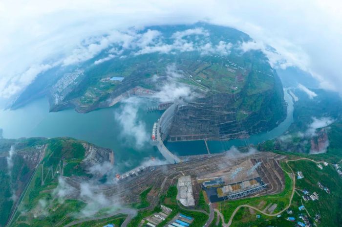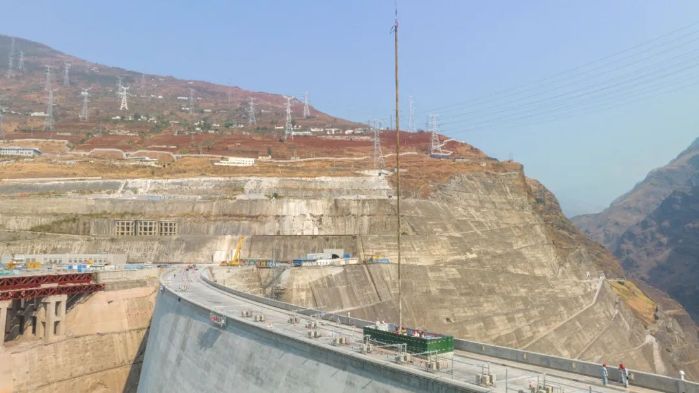 白鹤滩水电站工程大坝为300米级特高混凝土双曲拱坝,坝体混凝土总方量803万立方米,“体积”超过3个胡夫金字塔,全坝均使用低热水泥混凝土浇筑。