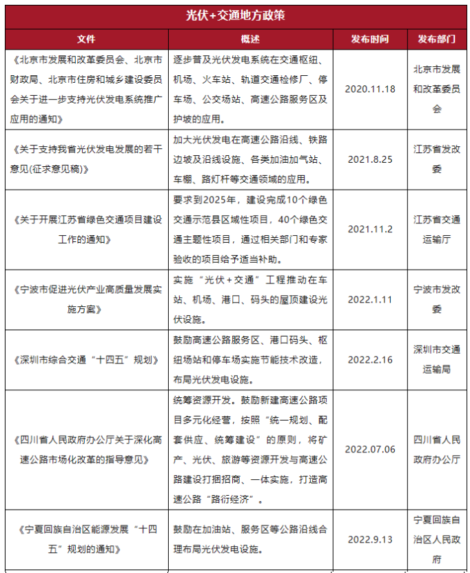 在我国提出双碳战略后,我国各部门对光伏与交通融合发展,发布了以下政策: