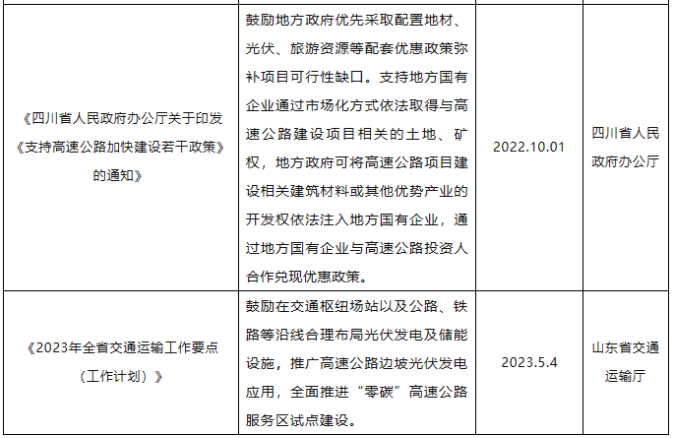 面对国家层面的支持与鼓励,各地方政府也纷纷响应纷纷发文支持“光伏+交通”发展,部分政策汇总见下表:
