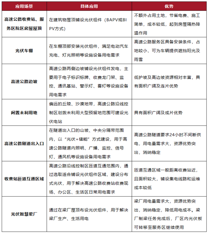 本文所述“光伏+高速公路”模式,一般指利用高速公路沿线的边坡、加油站、服务区、隧道隔离带、停车场遮阳棚、互通立交和匝道中的闲置土地等土地资源布置太阳能光伏组件,实现光伏发电、储能,为高速公路的运行、新能源汽车提供用能保障,并网模式一般为“自发自用,余电上网”。
