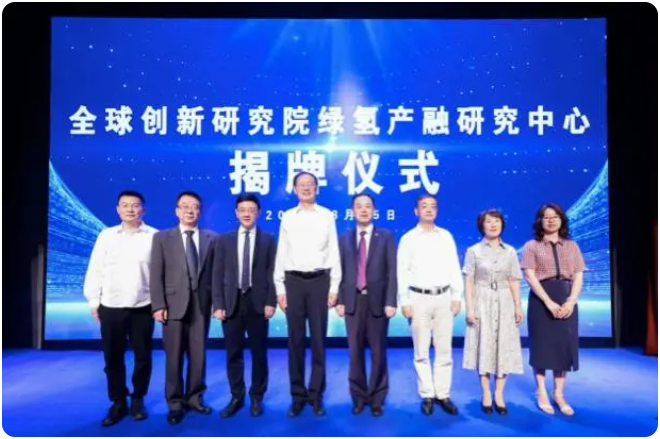 上海交通大学党委常务副书记顾锋,上海交通大学 终身教育学院党委书记李昕荣,教育部长江学者、上海交大特聘教授、终身教育学院院长、全球创新研究院院长胡洁,新疆乌鲁木齐经济技术开发区管委会、头屯河 区人民政府特派代表查新明副主席,申能集团有限公司党委委员、副总裁宋雪枫,上海交大设计研究总院董事兼执行总经理王云武,上海交大氢科学中心党支部书 记、办公室主任杨海燕共同为全球创新研究院绿氢产融研究中心揭牌。本中心由上海交通大学终身教育学院,联合上海能源环境交易所、上海市高效能源互联网创新 研究院、新疆新能源集团等机构联合发起。