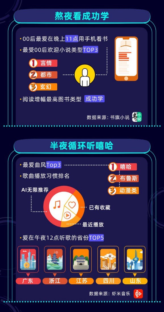 虾米数据显示,00后最喜爱的歌曲类型前三分别是:嘻哈、布鲁斯和动漫类。而且他们懒得切换,停留在AI智能推荐模式,听到上头。放眼全国,夜生活最丰富的的广东青年,深夜12点以后听歌的人数全国第一,其次是浙江、江苏、四川和山东。此外,书旗小说的数据显示,00后最爱在晚上11点开始用手机看书,言情类小说最受青睐。让人意想不到的是,成功学类书籍阅读增幅最高,熬夜看成功学成为许多00后的新选择。