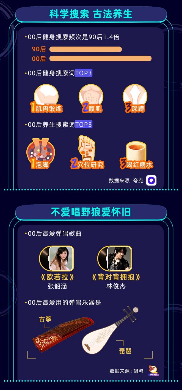 数据显示,00后通过夸克APP搜索“健身”相关内容的频次超90后四成。令人意想不到的是,他们热衷探索“泡脚”、“穴位研究”、“红糖水”等中国传统古法养生术。如果说90后是保温杯泡枸杞“佛系养生”,那一些00后已踏上高段位的“老中医”之路。