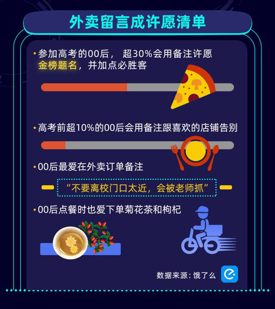 00后以学生群体居多,在闲鱼交易的闲置图书中,教辅类占到了45%以上,当代00后也用最绿色环保的形式完成了知识的传递。而在吃这件小事上,“学生党们”还留下了不少暖心细节。即将参加高考的00后,超30%会在外卖下单时备注许愿“金榜题名”,甚至还会点上一份“必胜客”来搏个好彩头。而高考毕业、即将与陪伴多年的餐饮店铺分别时,超10%的00后会在下单时,给店家留下祝福并道别。