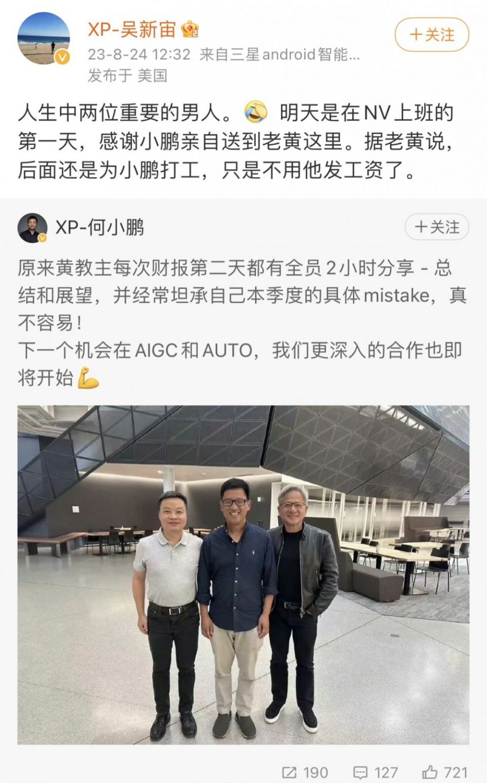 他表示,何小鹏和黄仁勋是“人生中两位重要的男人。”并称,“明天是在NV上班的第一天,感谢小鹏亲自送到老黄这里。据老黄(黄仁勋)说,后面还是为小鹏打工,只是不用他发工资了。”