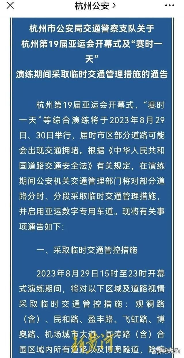 新 黄河记者注意到,杭州市公安局官方微信公众号8月26日发布了《关于杭州第19届亚运会开幕式及“赛时一天”演练期间采取临时交通管理措施的通告》。通告 称:杭州第19届亚运会开幕式、“赛时一天”等综合演练将于2023年8月29日、30日举行,届时市区部分道路可能会出现交通拥堵。根据《中华人民共和 国道路交通安全法》有关规定,在演练期间公安机关交通管理部门将对部分道路分时、分段采取临时交通管理措施,并启用亚运数字专用车道。同时,杭州警方也发 布通告,自9月1日起,无人机等低空漂浮物全域禁飞。