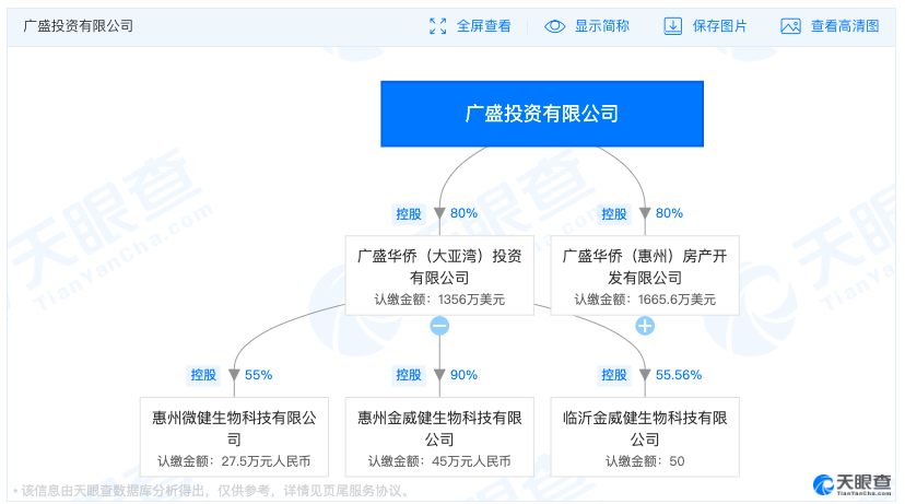 《商业观察》通过天眼查查询发现,广盛投资在内地投资设立了两家公司,其中,该公司对广盛华侨(大亚湾)投资有限公司投资1356万美元,持股比例80%;对广盛华侨(惠州)房产开发有限公司投资1665.6万美元,持股比例亦为80%。