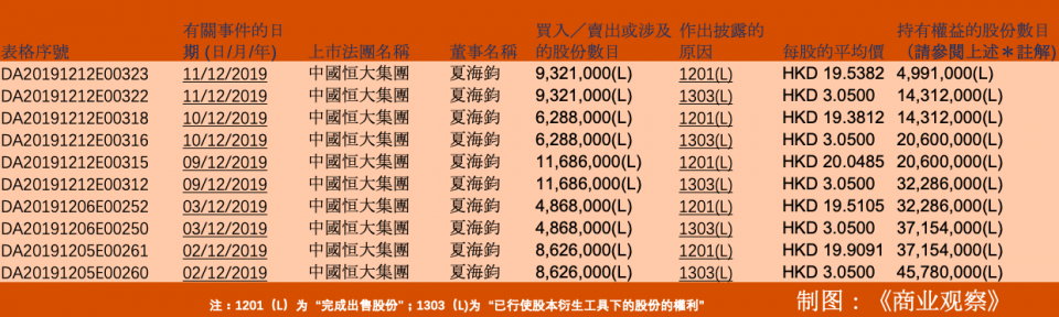 炣燃科技12月20日综合《商业观察》报道 据港交所权益披露信息,2019年12月内,中国恒大董事局副主席、总裁夏海钧5次公开出售股权。