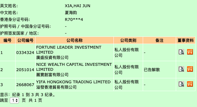 香港公司注册处综合资讯系统的信息则表明,除中国恒大之外,夏海钧在另外两家香港注册公司任职,并担任董事职务。两家公司分别为:广盛投资有限公司以及溢发香港贸易有限公司。