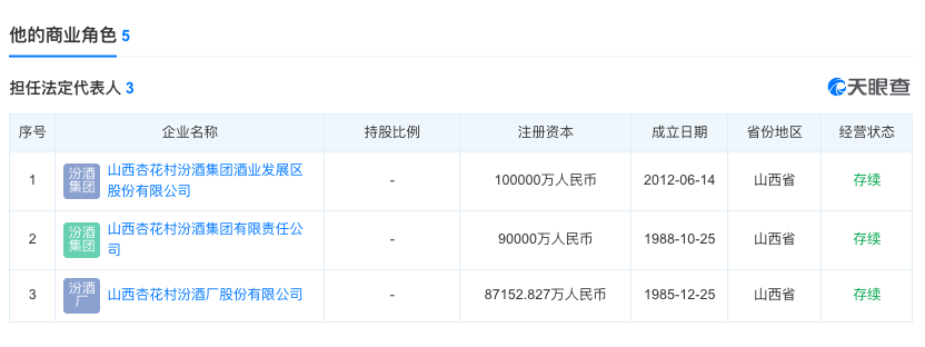 汾酒集团掌门人李秋喜在3家公司担任法人 来源:天眼查