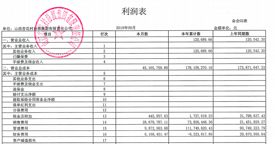 不过,该数据却与汾青酒厂评估报告的经营数据不符。北京中企华资产评估有限责任公司出具的评估报告显示,2019年1月至9月,汾青酒厂的营收为1.7亿元,差额近7000万元;同期净利润数据为944万元,差额近1500万元。