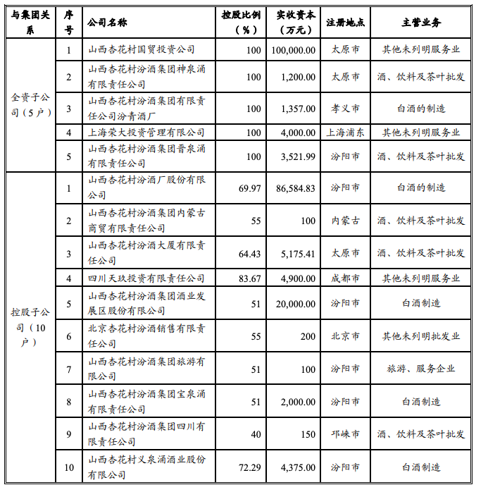 汾酒集团官网简介显示,汾酒集团以白酒生产销售为主,集贸易、旅游、餐饮等为一体的国家大型企业,集团下属5个全资子公司,11个控股子公司,其中山西汾酒是汾酒集团的核心子公司。