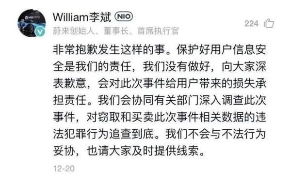 在去年12月份,蔚来汽车因用户数据遭不法人士泄露而受到社会广泛关注,当时蔚来汽车创始人、董事长兼CEO李斌就曾因此事道歉,并表示坚决不与犯罪行为妥协。而在9月5日晚,蔚来官方正式公布了该事件的调查结果。