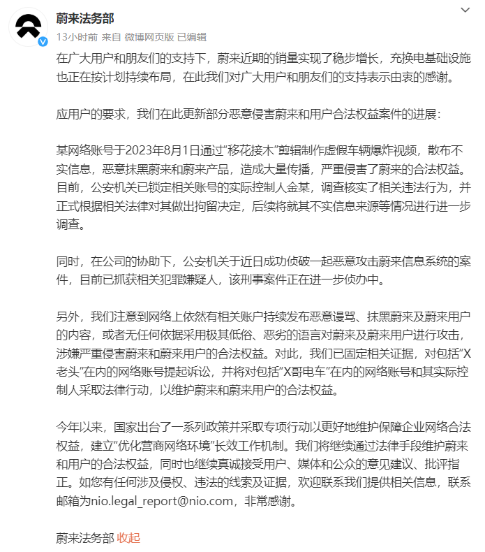 此次蔚来法务部还对部分造谣抹黑蔚来汽车的个人和自媒体背后的运营者进行了起诉,并且联合警方对部分账户的实际控制人依法进行了拘留,同时也对那些还在恶意抹黑蔚来的自媒体提出了警告。