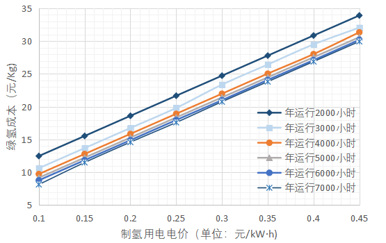 按照用电价格0.25元/kW·h,年运行小时数4000小时计算,制氢成本约为19元/kg,电价每降低0.05元/kW·h,制氢成本将降低约3元/kg。