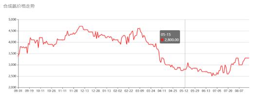 合成氨价格受市场供需影响较 大,2017-2021 年,市场均价在 2768-3470 元/t,2022 年上半年市场均价飙升至在 3758-5110 元/t 之间,下半年一度跌落至2746 元/吨,之后有所回升,至2023年8月合成氨价格围绕2500-3500元/吨区间震荡。