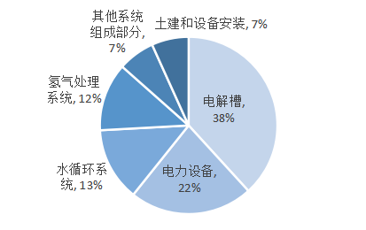电解水制氢系统主要由电解槽主体以及 BOP 辅助系统组成。BOP 辅助系统由电力设备(电源、变压器、整流器等)、气液分离及干燥纯化设备及其他设备构成,其投资主要构成如图所示。