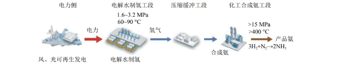 可再生能源合成氨技术,以清洁能源电解水生成的氢气取代传统工艺中的化石能源(煤、天然气等),与低温空气分离所得的氮气混合、加压、纯化后,通过合成氨反应器生成氨。主要能量消耗包括原料气压缩功、循环气压缩功和氨分离的冷冻功耗。