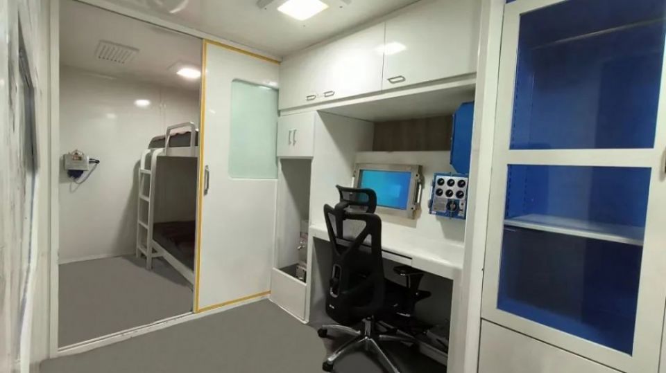 该休息舱具备送风、保暖、隔音、休息、通讯、监测、控制等功能。采用高强度不锈钢材质结构,由空调新风系统、气体环境报警监测装置、地面语音对讲扩播电话、 照明装置、防爆饮水机、图像监控、床铺、桌椅、洗漱台、储物柜等设施组成,可以为员工提供舱内休息、就餐、洗漱等生活服务,同时也可以作为矿井事故发生时 的应急避难场所,为员工提供安全保障。