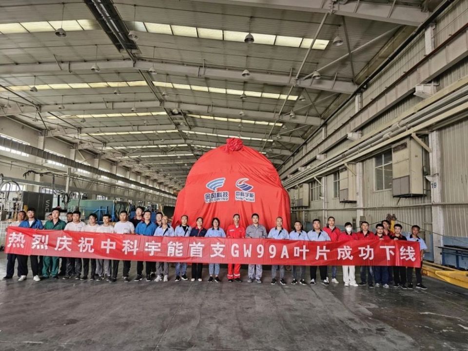 2023年9月7日,中科宇能科技发展有限公司(以下简称“中科宇能”)与金风科技股份有限公司(以下简称“金风科技”)联合开发的SW/GW99A叶片在保定生产基地成功下线,客户代表、生产团队携手参加下线仪式。