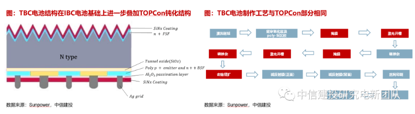 TBC电池在普通IBC电池结构的基础上叠加TOPCon的钝化结构,在保留IBC正面高电流优点的同时可以进一步提高电池开路电压,从而提升电池转换效率。