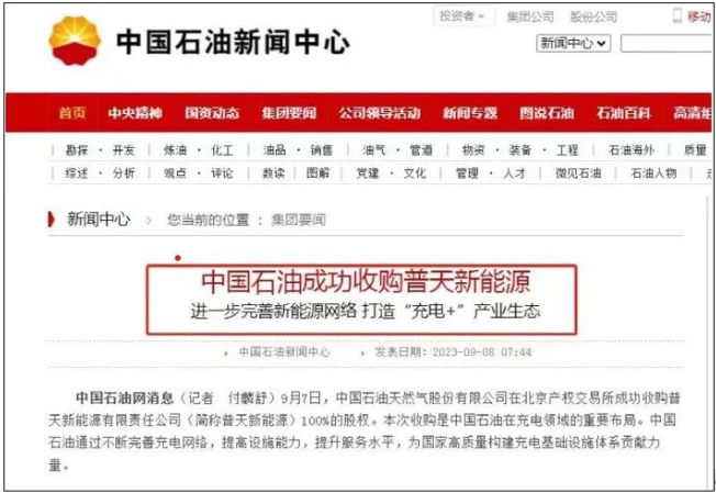 记者获悉,9月7日,中国石油正式收购普天新能源100%股权,此次股权转让的挂牌底价近15亿元。