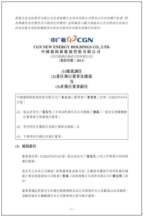 记者获悉,中广核旗下港股上市公司——中广核新能源发布《总裁调任、委任执行董事及总裁及非执行董事辞任》公告称:张志武因工作需要辞去兼任的总裁一职;任命李光明为中广核新能源总裁。