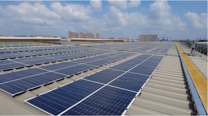 项目覆盖多个厂房屋顶,采用“自发自用,余电上网”的模式。开乐汽车光伏电站于5月开始开工建设,采用上迈轻质组件,充分利用了工厂内闲置彩钢瓦屋顶进行分 布式电站建设,达到节能降碳的目的,最后于8月实现并网运行。项目建设中所包含的轻质光伏屋顶,占地面积约65000平米,是目前全市最大规模的轻质光伏 项目。