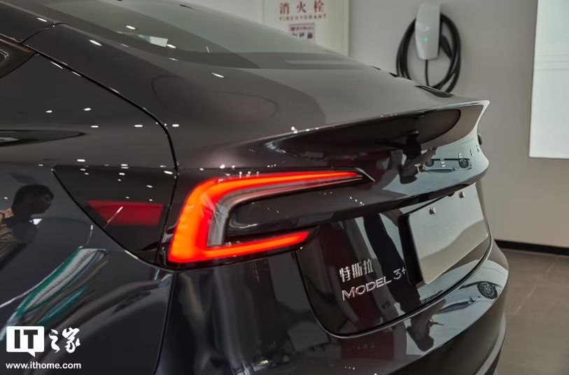 尾部变化比较大,采用了突出的环绕式 C 形尾灯,辨识度更高,尾灯之间的特斯拉字样取代了原本的 LOGO。此外,新车的尾部标识也变成了“Model 3+”。